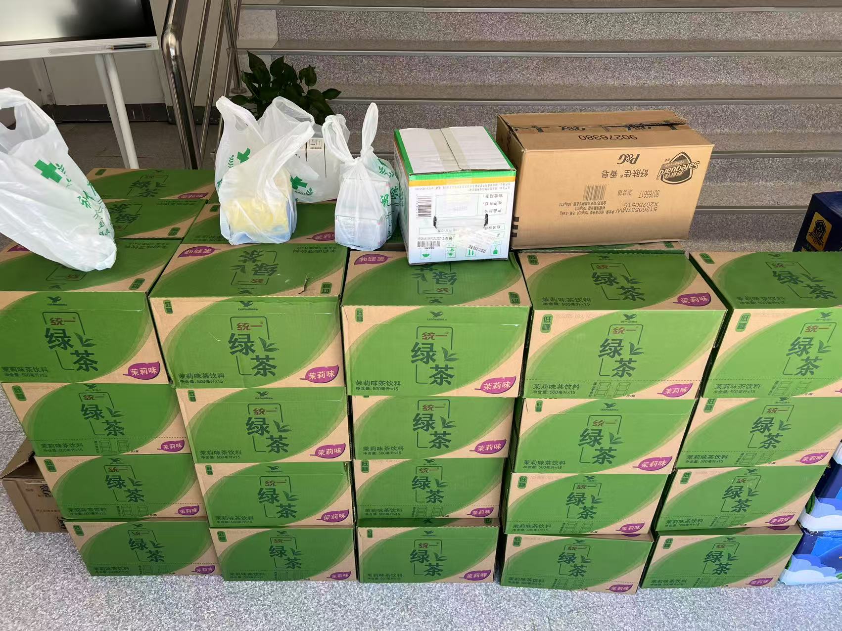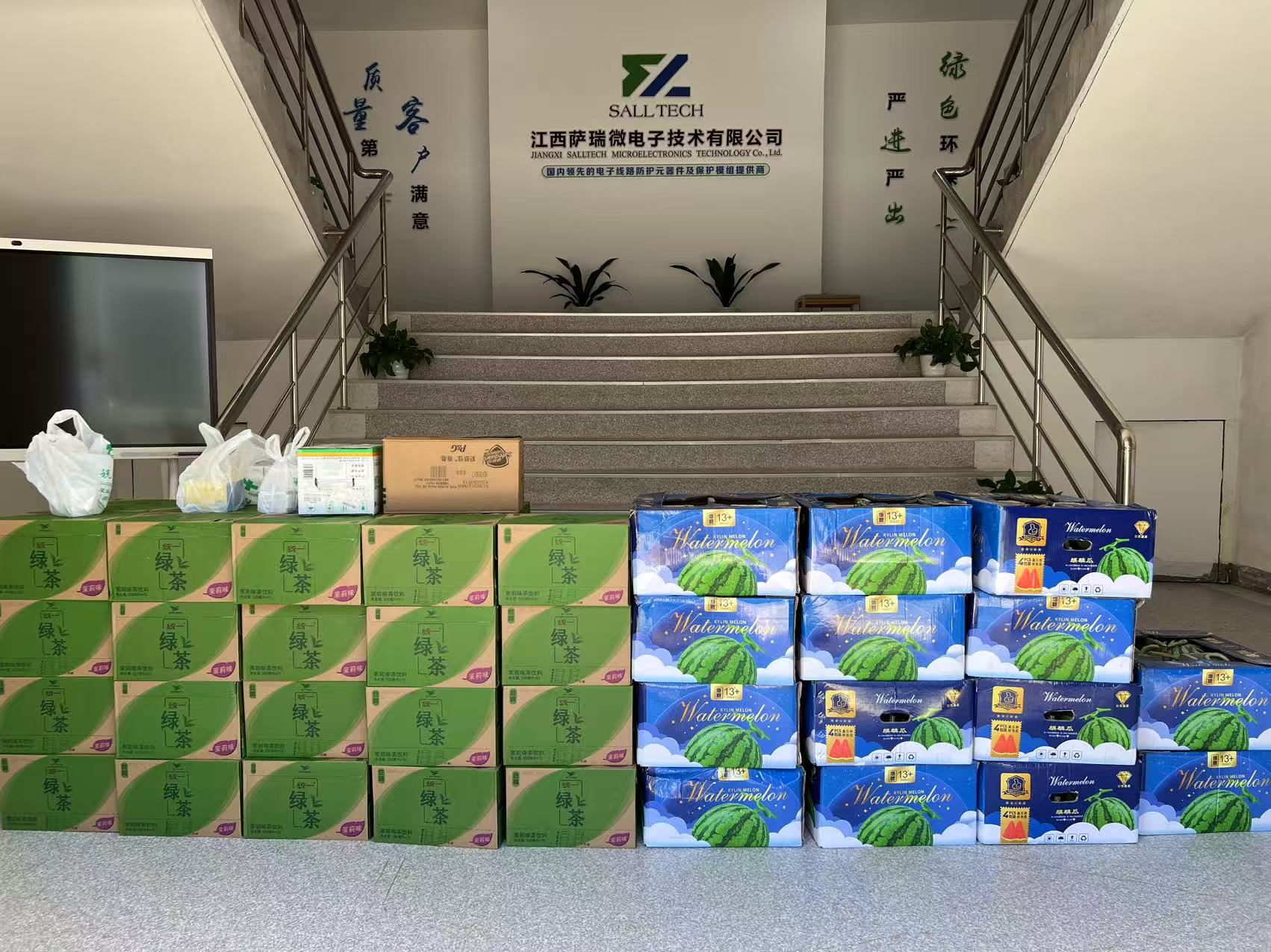 这份 “降温大礼包” 可真是贴心又实用,里面有清热解暑的绿茶饮品,一口下去,瞬间驱散了工作带来的疲惫;还有新鲜多汁的西瓜,是夏日里最受欢迎的美味;舒肤佳香皂能帮助职工们在忙碌工作后清洁肌肤,带来洁净舒适的体验;而金银花则具有清热解毒的功效,让大家在夏日里多一份健康保障。